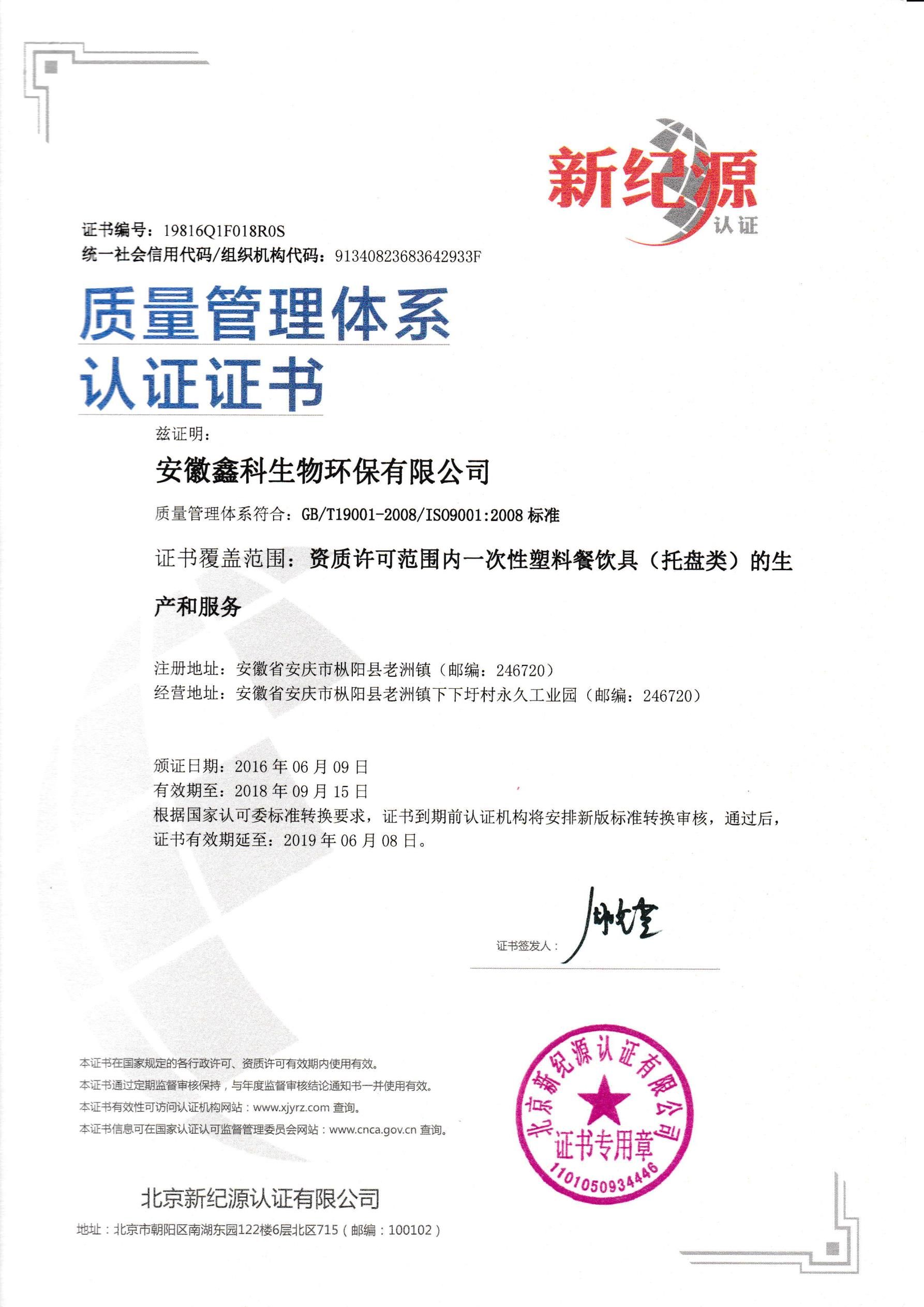 質量(liàng)管理體係證書